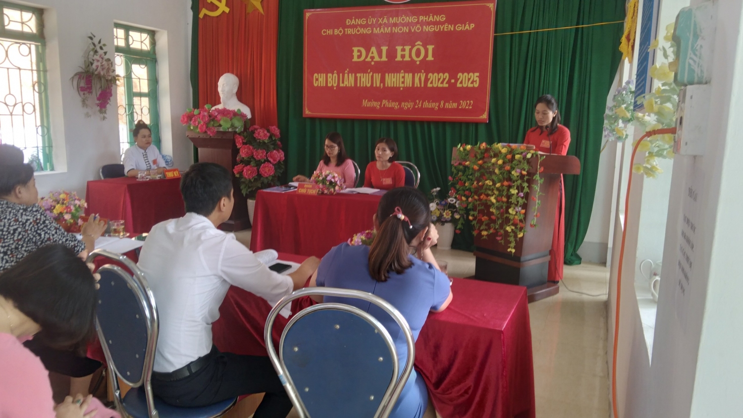 Sau một thời gian chuẩn bị tích cực, với tinh thần trách nhiệm cao, Chi bộ trường MN Võ Nguyên Giáp xã Mường Phăng đã hoàn thành công tác chuẩn bị Đại hội, được sự nhất trí của  Đảng ủy xã Mường Phăng, Ngày 24/8/2022 Chi bộ trường MN Võ Nguyên Giáp xã Mường Phăng long trọng tổ chức Đại hội chi bộ lần thứ IV, Nhiệm kỳ 2022 – 2025.