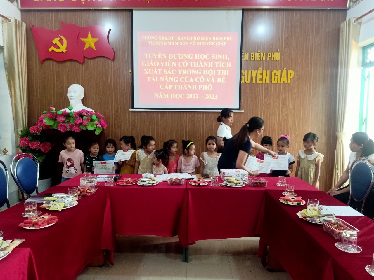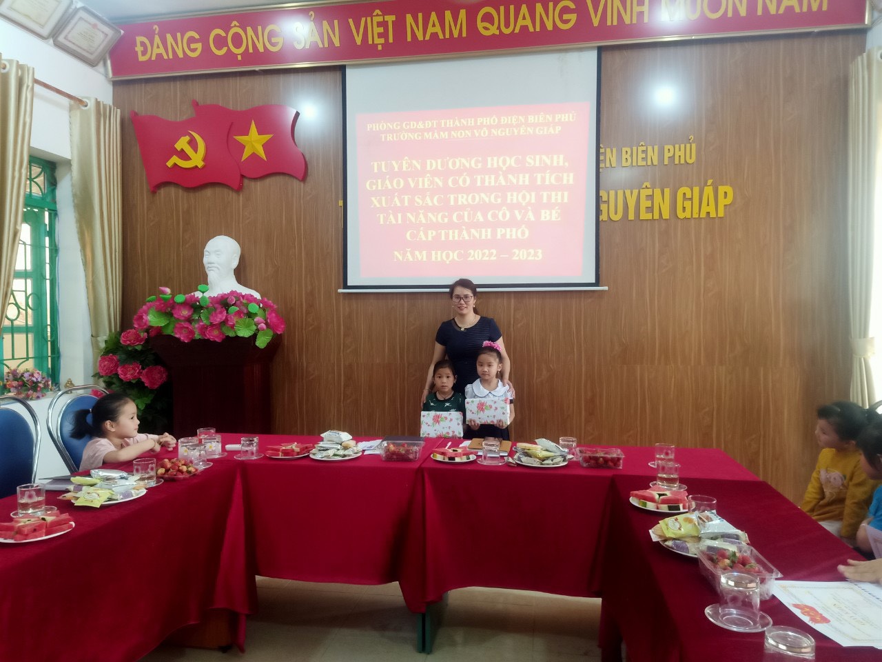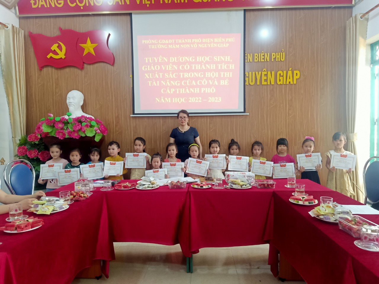 Chiều ngày 21/4/2023 trường mầm non Võ Nguyên Giáp xã Mường Phăng đã tổ chức gặp mặt tuyên dương 14 em học sinh và 3 giáo viên có thành tích xuất sắc trong hội thi “ Tài năng của cô và bé” cấp thành phố năm học 2022-2023. Về dự với buổi lễ có phụ huynh và học sinh của 14 em học tham gia hội thi và tập thể cán bộ giáo viên nhân viên trong trường.
