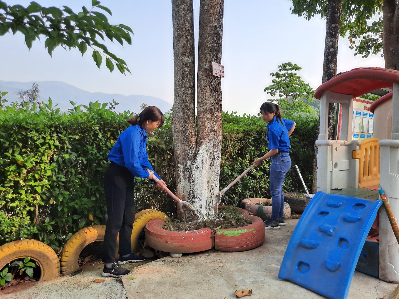 Với tình yêu quê hương, các cô giáo luôn hòa mình với đoàn viên thanh niên địa phương để trồng hoa cây cảnh, làm đẹp đường làng