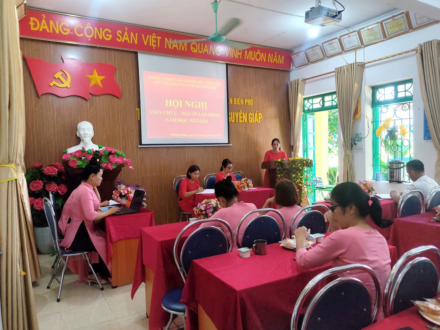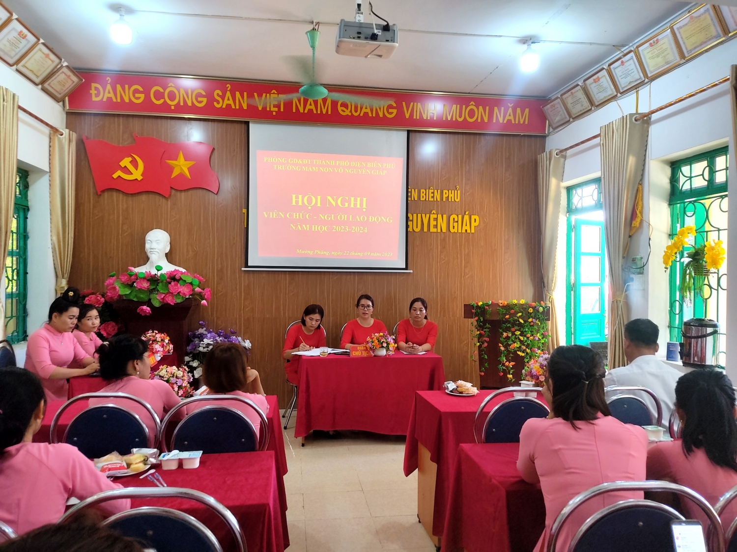 Để thực hiện tốt nhiệm vụ năm học 2023 -2024, được sự nhất trí chỉ đạo của Phòng GD&ĐT thành phố Điện Biên Phủ, sự nhất trí của chi bộ. Sáng ngày 22 tháng 9 năm 2023, trường Mầm non Võ Nguyên Giáp xã Mường Phăng tổ chức Hội nghị cán bộ viên chức và người lao động năm học 2023-2024. Tham dự đại hội có đồng chí Lý Kim Phượng – Bí thư Chi bộ, Hiệu trưởng nhà trường, đồng chí Bùi Thị Hồng Nhung- Phó bí thư chi bộ, Phó hiệu trưởng nhà trường đồng chí Đoàn Thị Bích – Chủ tịch công đoàn, Phó hiệu trưởng nhà trường, và 15 cán bộ công nhân viên chức trong trường có mặt đông đủ. Hội nghị đã đánh giá những kết quả đạt được trong công tác giáo dục của năm học trước, mặt khác nghiêm túc rút ra nguyên nhân của những hạn chế, tồn tại. Từ đó đề ra phương hướng hoạt động phù hợp cho năm học mới. Đây cũng là một hoạt động quan trọng nhằm phát huy quyền làm chủ của cán bộ, giáo viên, nhân viên từ đó đề xuất ý kiến, bày tỏ nguyện vọng đối với Ban giám hiệu nhà trường để góp phần xây dựng nhà trường ngày càng vững mạnh. Toàn thể cán bộ, công chức, viên chức và người lao động của nhà trường đã tham gia hội nghị trong không khí vui tươi, phấn khởi.Với sự nhất trí cao của toàn thể hội nghị, với sự cố gắng, nỗ lực và cống hiến của mỗi cá nhân tin tưởng rằng sẽ góp phần tạo nên sự thành công của nhà trường trong năm học 2023-2024.Sau đây là một số hình ảnh của Hội nghị.