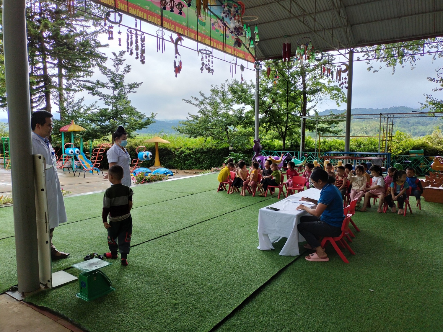 Sáng ngày 15/5/2023 Trường MN Võ Nguyên Giáp xã Mường Phăng phối hợp với trạm y tế xã Mường Phăng cân đo trẻ định kỳ và cho trẻ uống Vitamin A và thuốc tảy giun. Với sự tham gia của các bác sỹ trạm y tế, nhân viên y tế nhà trường các bác sỹ đã khám và cân đo cho 198 cháu học sinh, cùng với sự phối hợp của các cô giáo chủ nhiệm các cháu đều có tâm lý vô cùng thoải mái, tự tin hợp tác tốt với các bác sỹ. kết quả cân đo và cho trẻ uống VTM A, thuốc tẩy giun đã được cán bộ y tế ghi chếp đầy đủ, chi tiết trong sổ theo dõi sức khỏe của trẻ. Việc khám cân đo và cho trẻ uống VTM A, thuốc tảy giun là một việc làm hết sức thiết thực và ý nghĩa, thông qua việc khám đã góp phần không nhỏ trong việc nâng cao ý thức của phụ huynh trong việc chăm sóc sức khỏe cho trẻ.