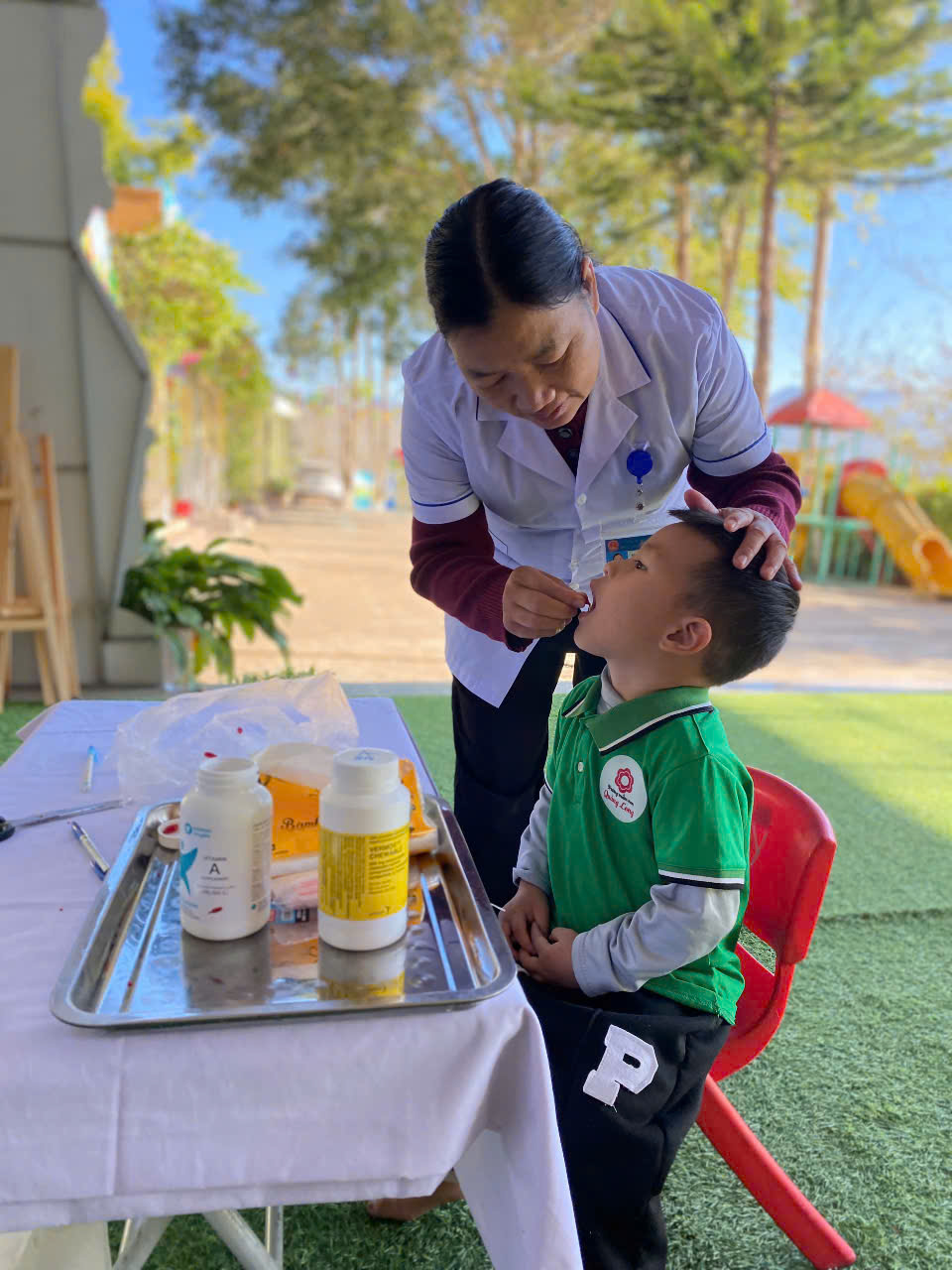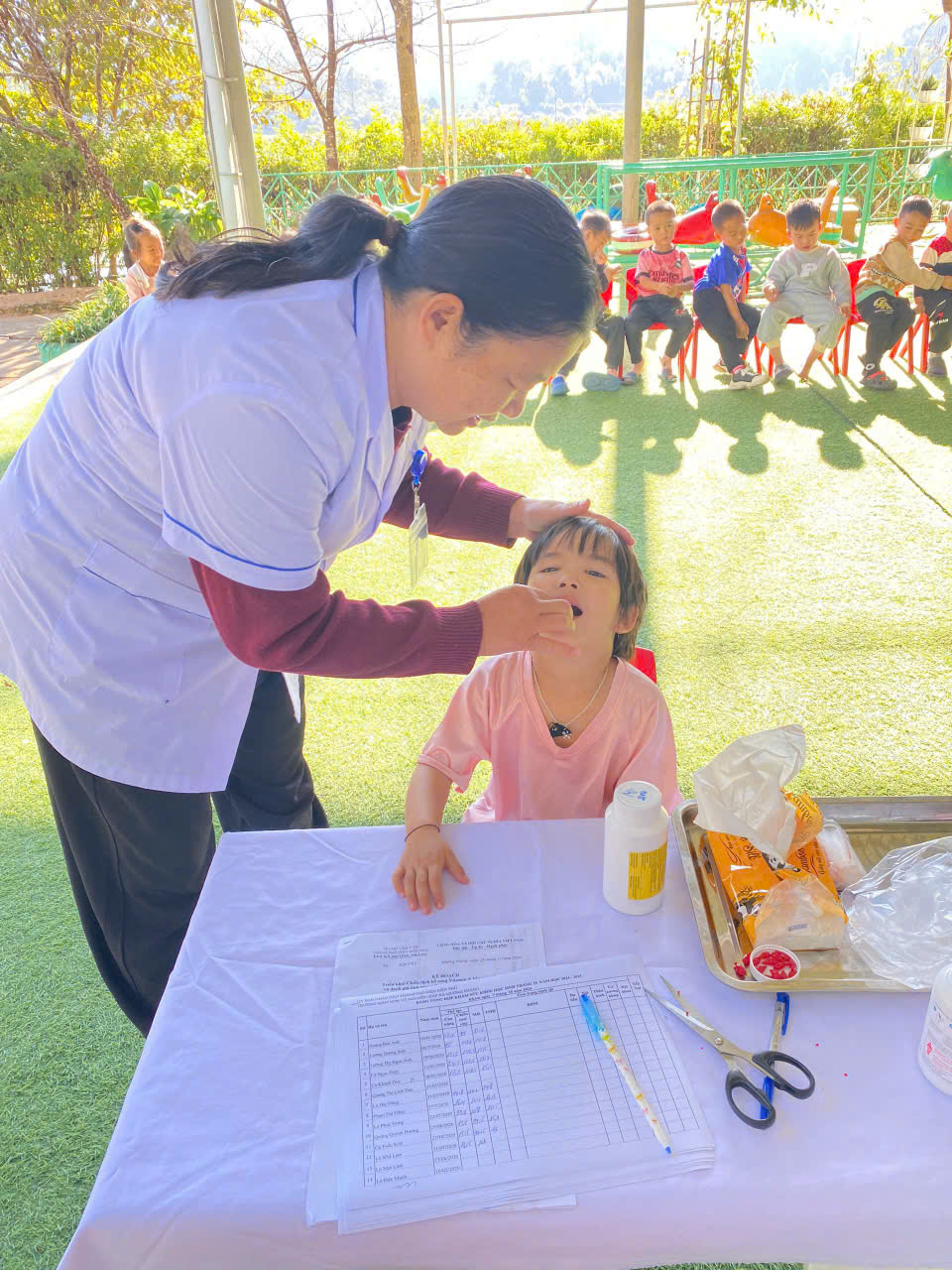 TRƯỜNG MẦM NON VÕ NGUYÊN GIÁP PHỐI HỢP VỚI TRẠM Y TẾ XÃ MƯỜNG PHĂNG CÂN ĐO, CHO TRẺ UỐNG VITAMIN A VÀ THUỐC TẨY GIUN