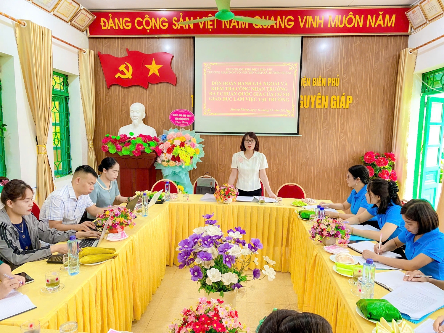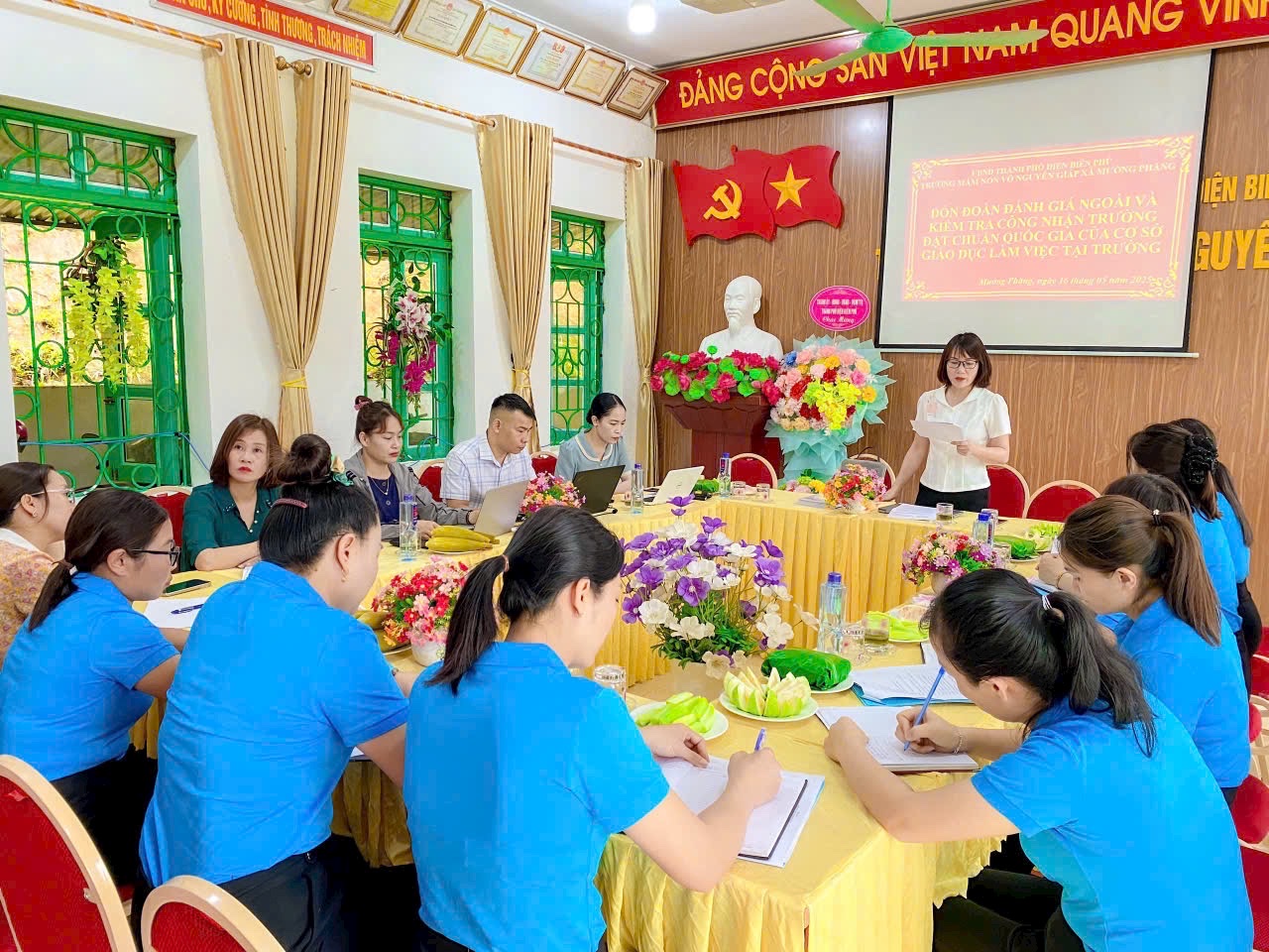 Sau thời gian nghiên cứu hồ sơ tự đánh giá, sáng ngày 16/5/2025 Trường Mầm non Võ Nguyên Giáp xã Mường Phăng vinh dự được đón tiếp đoàn đánh giá ngoài của Sở Giáo dục và Đào tạo về khảo sát chính thức tại trường. Đoàn gồm 7 thành viên, do đồng chí Lê Quang Vinh - Phó Giám đốc Sở Giáo dục và Đào tạo làm trưởng đoàn. Đồng chí Trần Thị Thúy – Phó Trưởng phòng Giáo dục Mầm non – Tiểu học làm thư ký. Về phía phòng GD&ĐT có các đồng chí: Đồng chí Bùi Thị Thu Hiền - Phó trưởng Phòng GD&ĐT thành phố Điện Biên Phủ, cùng các đồng chí chuyên viên cấp học Mầm non. Về phía chính quyền địa phương có đồng chí Hoàng Trung Thành - Phó chủ tịch UBND xã Mường Phăng. Tại buổi làm việc, đoàn đánh giá đã kiểm tra thực tế CSVC, trang thiết bị, các phòng chức năng, bếp ăn, tham quan các lớp và việc tổ chức các hoạt động chăm sóc nuôi dưỡng, giáo dục trẻ của nhà trường, nghiên cứu báo cáo, tài liệu do nhà trường cung cấp, kiểm tra các thông tin minh chứng của các tiêu chuẩn... Cũng tại buổi làm việc, đại diện đoàn đã gặp gỡ, trao đổi với các thành viên của Hội đồng tự đánh giá, phỏng vấn giáo viên, BGH nhà trường về hoạt động nuôi dưỡng, chăn sóc giáo dục trẻ. Kết thúc buổi làm việc, với tinh thần trách nhiệm cao, khách quan, dân chủ, đoàn đánh giá ngoài đã ghi nhận và đánh giá cao những điểm mạnh nổi bật của nhà trường, cụ thể: Nhà trường có cơ cấu bộ máy đảm bảo theo quy định, hồ sơ đầy đủ thông tin, sắp xếp khoa học, hợp lí; trang thiết bị dạy học, cơ sở vật chất đáp ứng điều kiện thực hiện CTGDMN. Môi trường xanh, sạch, đẹp, thân thiện... đáp ứng yêu cầu công tác chăm sóc nuôi dưỡng, giáo dục trẻ. Ban giám hiệu có sự chỉ đạo, định hướng đúng đắn trong việc xây dựng trường học hạnh phúc, thực sự lấy trẻ làm trung tâm... Đồng thời, đoàn đánh giá cũng đưa ra những tư vấn để nhà trường tiếp tục nâng cao chất lượng công tác chăm sóc nuôi dưỡng, giáo dục trẻ và phát triển hơn nữa.