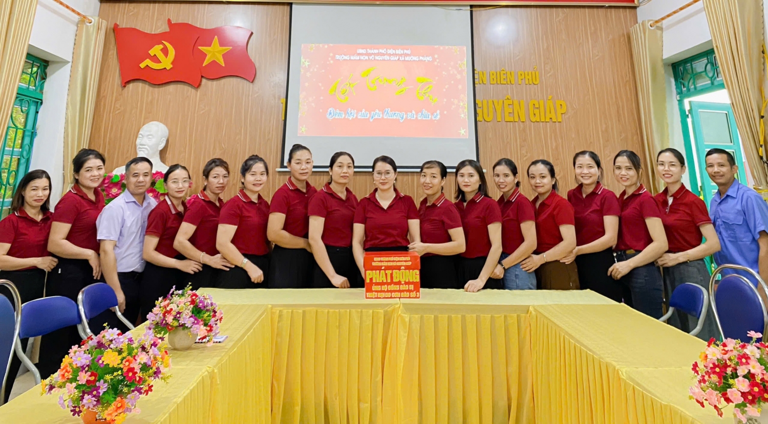 Trung Thu năm 2024, thay vì những hoạt động tưng bừng, rộn rã, Trường Mầm non Võ Nguyên Giáp, xã Mường Phăng đã tổ chức chương trình "Tết trung thu - Đêm hội của yêu thương và chia sẻ" để ủng hộ đồng bào bị thiệt hại do bão lũ. Tổng số tiền nhà trường quyên góp được là: 6.240.000 đồng sẽ được chuyển về tài khoản của UBMTTQ Việt Nam tỉnh Điện Biên để kịp thời phân bổ, hỗ trợ tới các địa phương bị ảnh hưởng do cơn bão số 3 gây ra. Qua đó, tích cực chung tay góp sức, ủng hộ về tinh thần và cả vật chất để giúp đỡ nhân dân các tỉnh, thành phố bị thiệt hại do bão lũ gây ra cũng như giúp người dân vượt qua mọi khó khăn mất mát, sớm ổn định cuộc sống và và các bạn học sinh sớm được tới trường học tập.