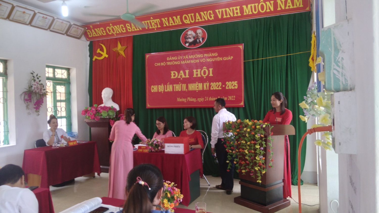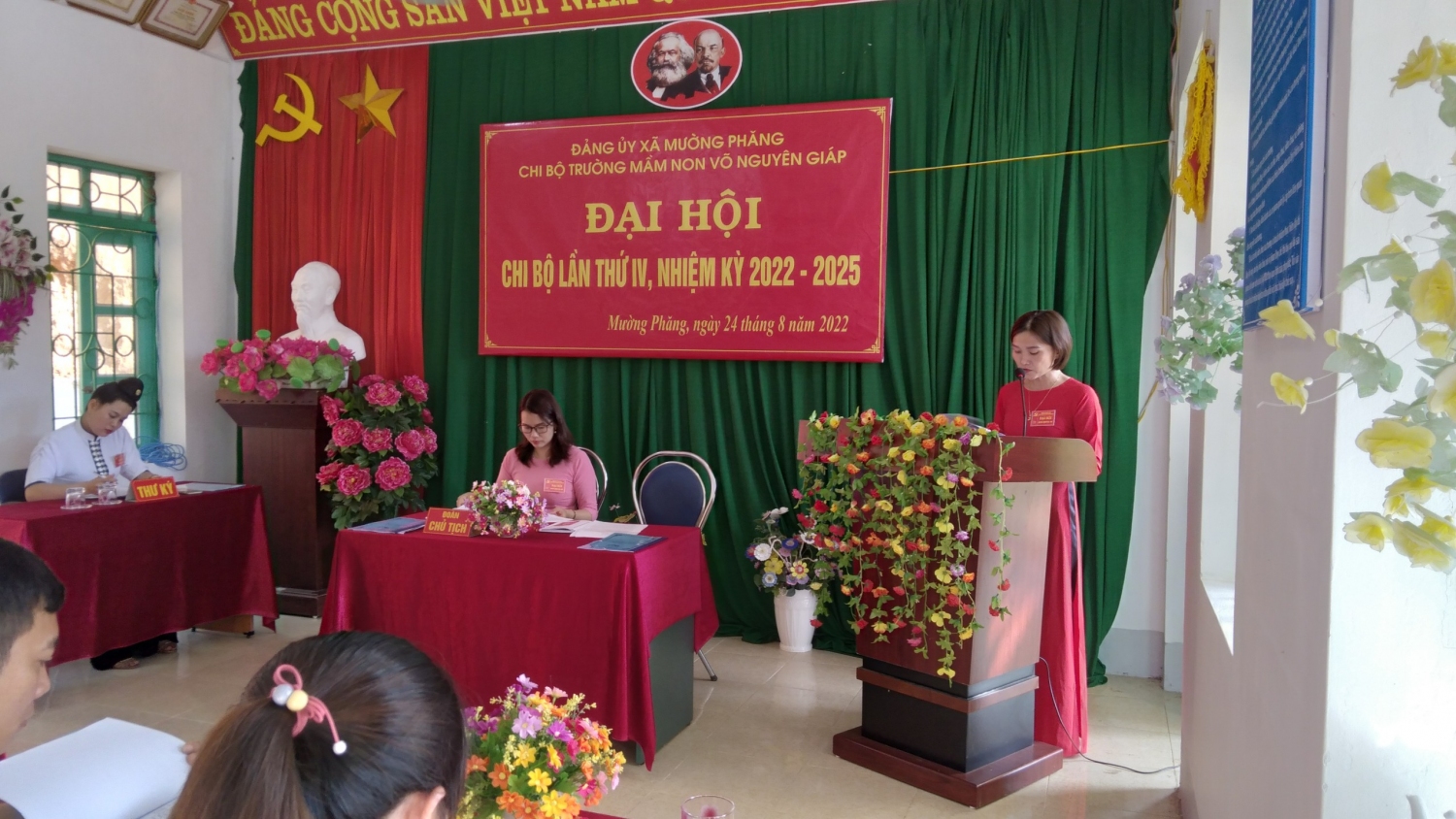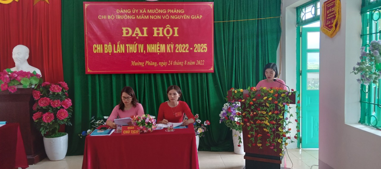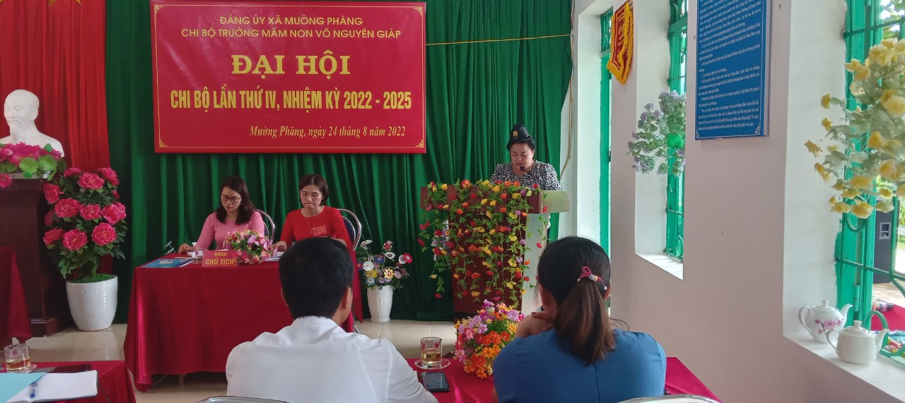 Sau một thời gian chuẩn bị tích cực, với tinh thần trách nhiệm cao, Chi bộ trường MN Võ Nguyên Giáp xã Mường Phăng đã hoàn thành công tác chuẩn bị Đại hội, được sự nhất trí của  Đảng ủy xã Mường Phăng, Ngày 24/8/2022 Chi bộ trường MN Võ Nguyên Giáp xã Mường Phăng long trọng tổ chức Đại hội chi bộ lần thứ IV, Nhiệm kỳ 2022 – 2025.