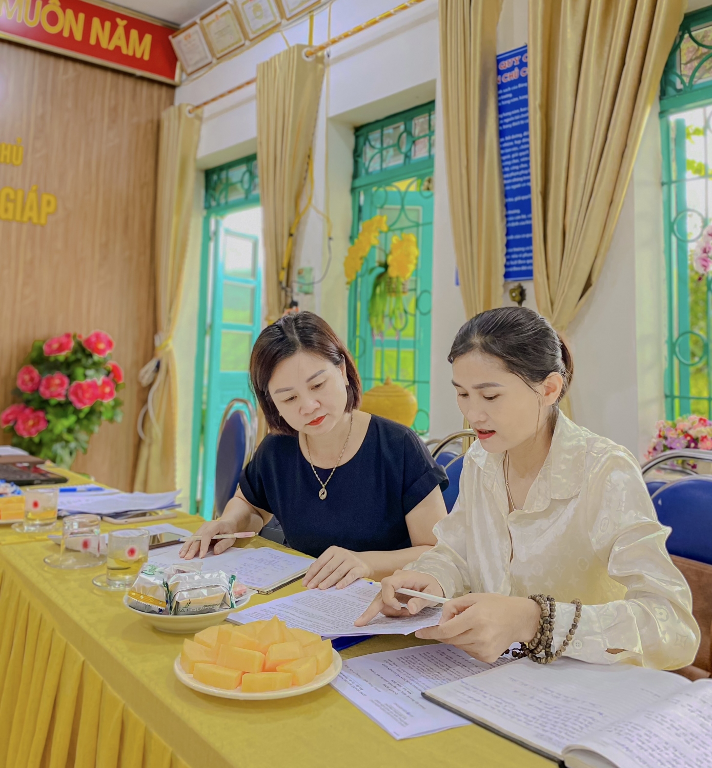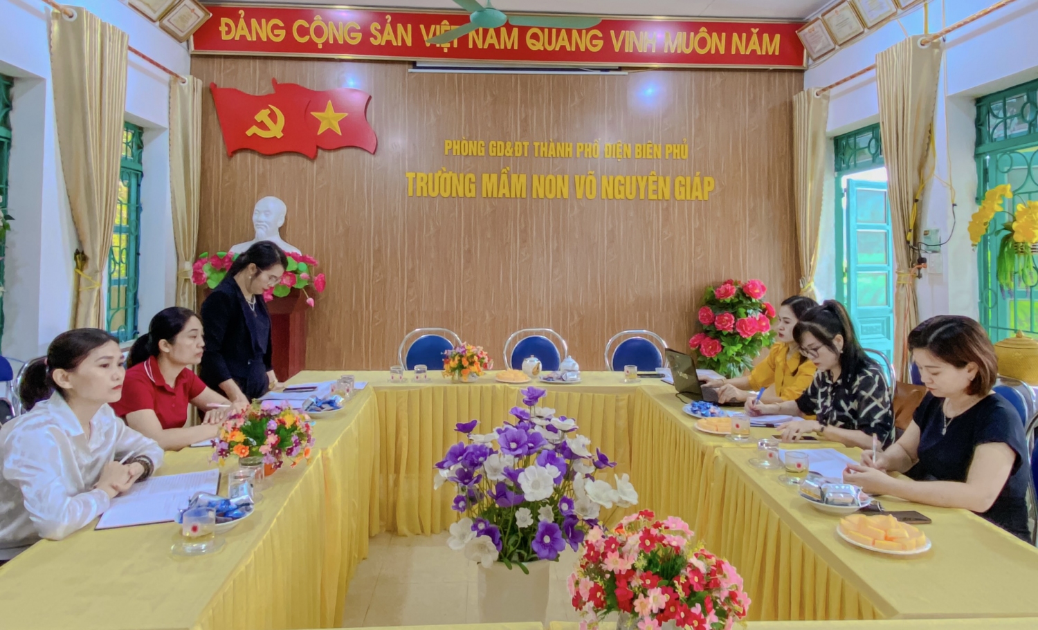 Sáng ngày 20/8/2024 trường MN Võ Nguyên Giáp xã Mường Phăng đón đoàn kiểm tra của phòng GD&ĐT thành phố Điện Biên Phủ về kiểm tra các điều kiện chuẩn bị năm học 2024-2025. Đoàn kiểm tra đã tiến hành kiểm tra việc phân công cho CB, GV, NV trong trường, kiểm tra cơ sở vật chất nhà trường, công tác tuyển sinh, xây dựng chương trình nhà trường...Nhà trường đã được đoàn rút kinh nghiệm, tư vẫn, hướng  dẫn khắc phục những tồn tại để chuẩn bị mọi điều kiện tốt nhất cho năm học mới.