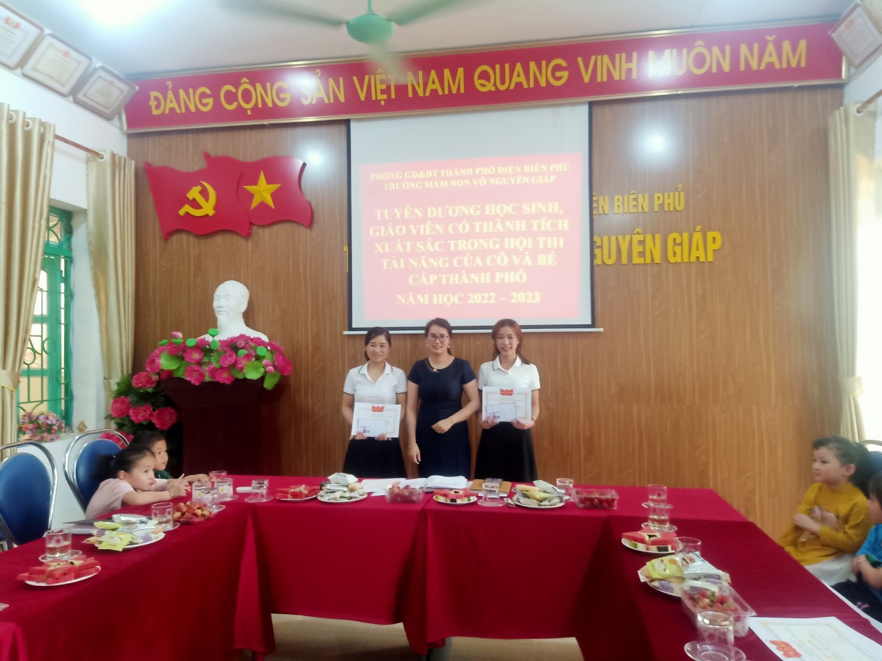Chiều ngày 21/4/2023 trường mầm non Võ Nguyên Giáp xã Mường Phăng đã tổ chức gặp mặt tuyên dương 14 em học sinh và 3 giáo viên có thành tích xuất sắc trong hội thi “ Tài năng của cô và bé” cấp thành phố năm học 2022-2023. Về dự với buổi lễ có phụ huynh và học sinh của 14 em học tham gia hội thi và tập thể cán bộ giáo viên nhân viên trong trường.