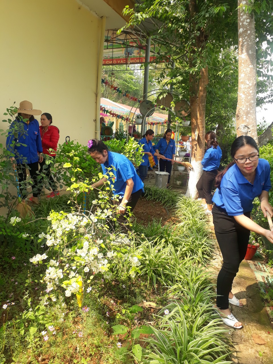 Với tình yêu quê hương, các cô giáo luôn hòa mình với đoàn viên thanh niên địa phương để trồng hoa cây cảnh, làm đẹp đường làng