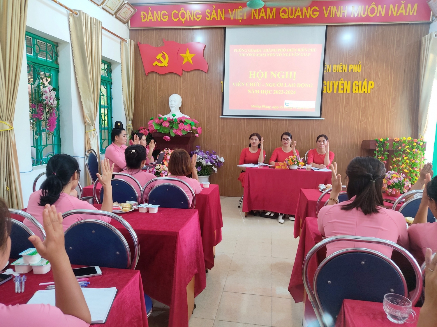 Để thực hiện tốt nhiệm vụ năm học 2023 -2024, được sự nhất trí chỉ đạo của Phòng GD&ĐT thành phố Điện Biên Phủ, sự nhất trí của chi bộ. Sáng ngày 22 tháng 9 năm 2023, trường Mầm non Võ Nguyên Giáp xã Mường Phăng tổ chức Hội nghị cán bộ viên chức và người lao động năm học 2023-2024. Tham dự đại hội có đồng chí Lý Kim Phượng – Bí thư Chi bộ, Hiệu trưởng nhà trường, đồng chí Bùi Thị Hồng Nhung- Phó bí thư chi bộ, Phó hiệu trưởng nhà trường đồng chí Đoàn Thị Bích – Chủ tịch công đoàn, Phó hiệu trưởng nhà trường, và 15 cán bộ công nhân viên chức trong trường có mặt đông đủ. Hội nghị đã đánh giá những kết quả đạt được trong công tác giáo dục của năm học trước, mặt khác nghiêm túc rút ra nguyên nhân của những hạn chế, tồn tại. Từ đó đề ra phương hướng hoạt động phù hợp cho năm học mới. Đây cũng là một hoạt động quan trọng nhằm phát huy quyền làm chủ của cán bộ, giáo viên, nhân viên từ đó đề xuất ý kiến, bày tỏ nguyện vọng đối với Ban giám hiệu nhà trường để góp phần xây dựng nhà trường ngày càng vững mạnh. Toàn thể cán bộ, công chức, viên chức và người lao động của nhà trường đã tham gia hội nghị trong không khí vui tươi, phấn khởi.Với sự nhất trí cao của toàn thể hội nghị, với sự cố gắng, nỗ lực và cống hiến của mỗi cá nhân tin tưởng rằng sẽ góp phần tạo nên sự thành công của nhà trường trong năm học 2023-2024.Sau đây là một số hình ảnh của Hội nghị.