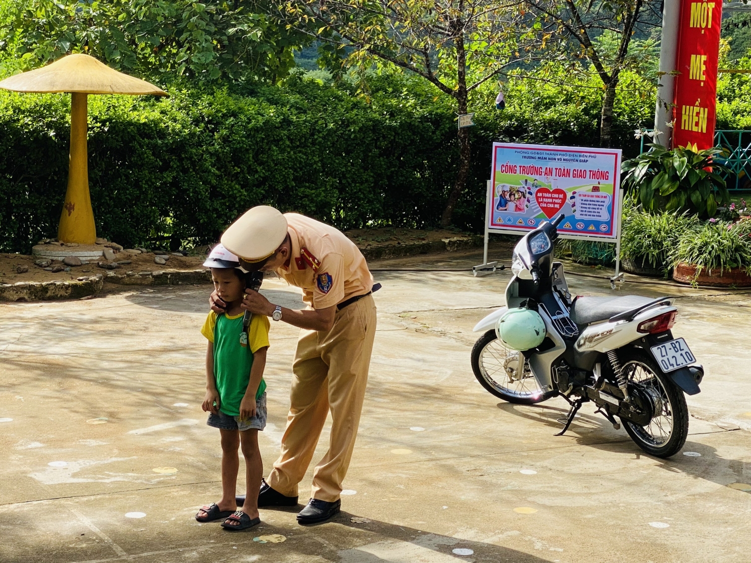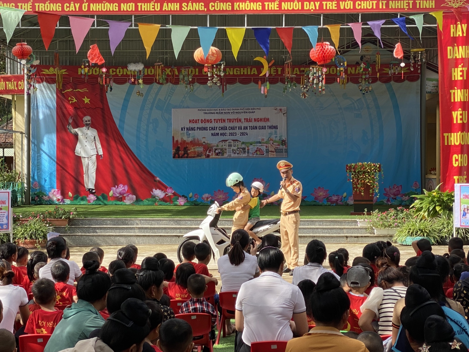 Song song với công tác PCCC là nhiệm vụ đảm bảo ATGT – đây đều là những nội dung hết sức quan trọng trong công tác đảm bảo an toàn tại trường học. Đặc biệt tháng 9 cũng là tháng cao điểm ATGT, do đó để thực hiện tốt và nâng cao nhận thức, vai trò, trách nhiệm trong công tác đảm bảo ATGT, PCCC và CNCH cho mỗi cán bộ, giáo viên, học sinh, phụ huynh, Trường MN Võ Nguyên Giáp, xã Mường Phăng phối hợp với  Phòng Cảnh sát PCCC và CNCH, Đội Cảnh sát Giao thông – Trật tự Công an thành phố tổ chức hoạt động tuyên truyền, trải nghiệm kỹ năng PCCC và đảm bảo ATGT.