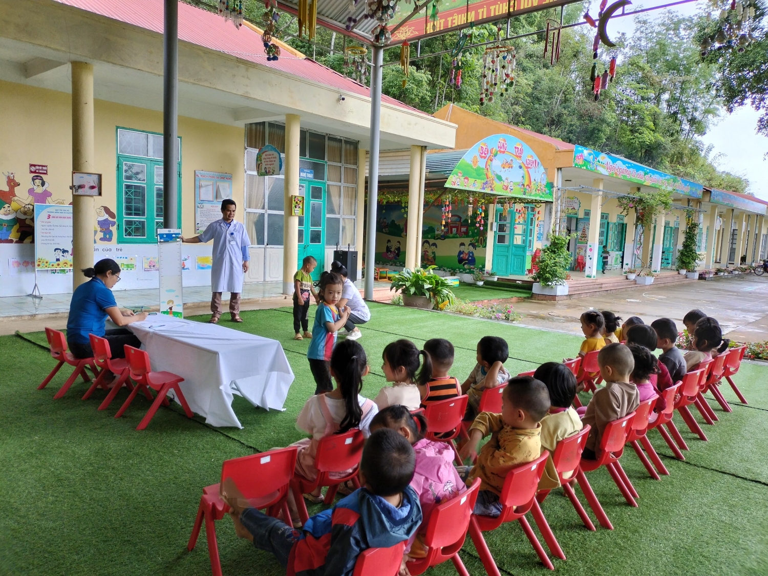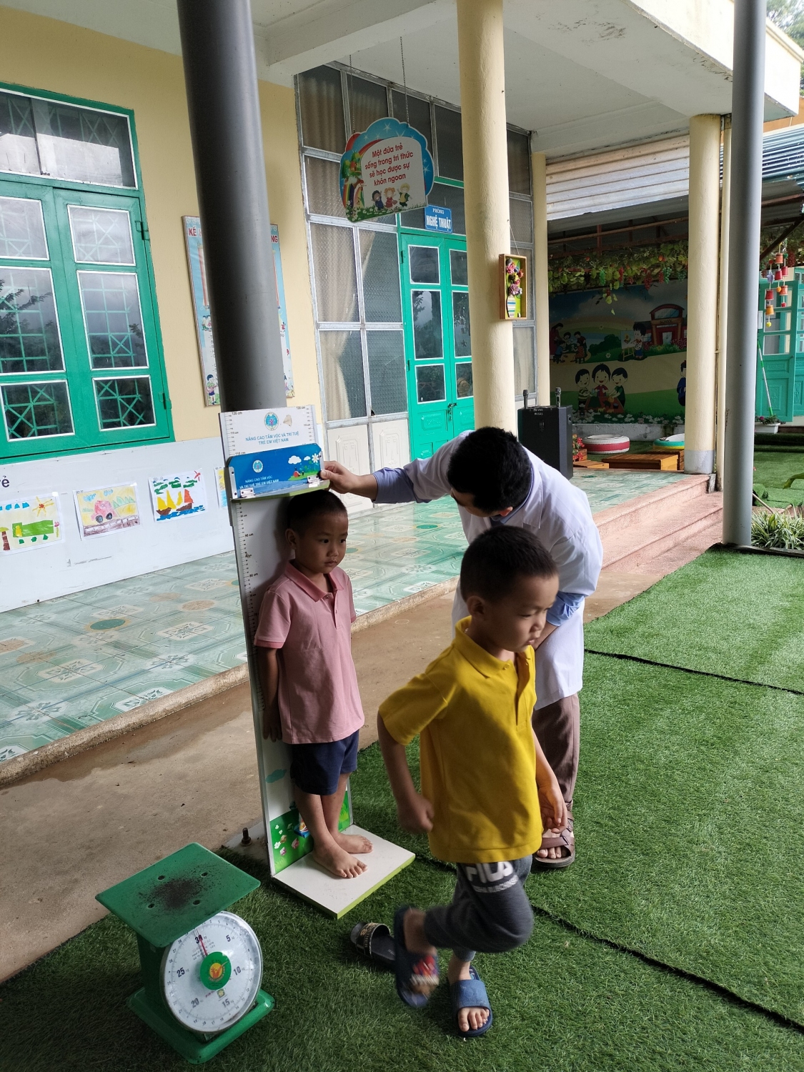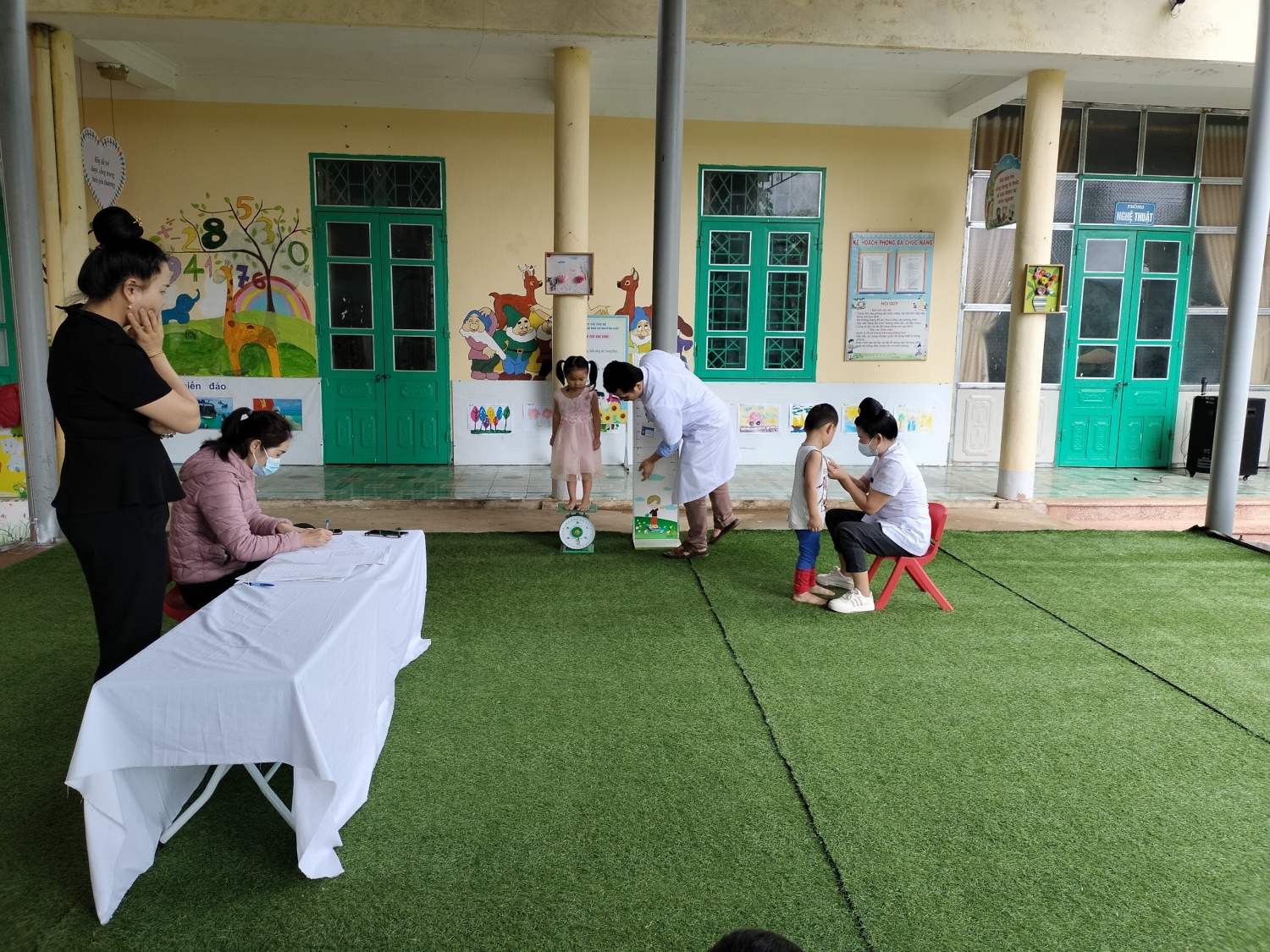 Sáng ngày 15/5/2023 Trường MN Võ Nguyên Giáp xã Mường Phăng phối hợp với trạm y tế xã Mường Phăng cân đo trẻ định kỳ và cho trẻ uống Vitamin A và thuốc tảy giun. Với sự tham gia của các bác sỹ trạm y tế, nhân viên y tế nhà trường các bác sỹ đã khám và cân đo cho 198 cháu học sinh, cùng với sự phối hợp của các cô giáo chủ nhiệm các cháu đều có tâm lý vô cùng thoải mái, tự tin hợp tác tốt với các bác sỹ. kết quả cân đo và cho trẻ uống VTM A, thuốc tẩy giun đã được cán bộ y tế ghi chếp đầy đủ, chi tiết trong sổ theo dõi sức khỏe của trẻ. Việc khám cân đo và cho trẻ uống VTM A, thuốc tảy giun là một việc làm hết sức thiết thực và ý nghĩa, thông qua việc khám đã góp phần không nhỏ trong việc nâng cao ý thức của phụ huynh trong việc chăm sóc sức khỏe cho trẻ.