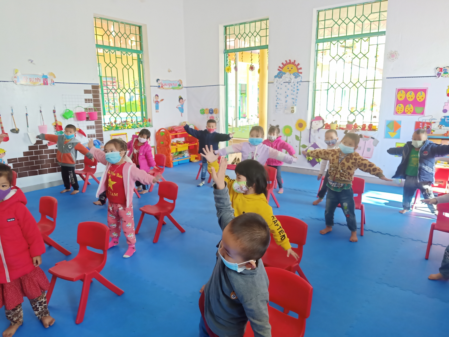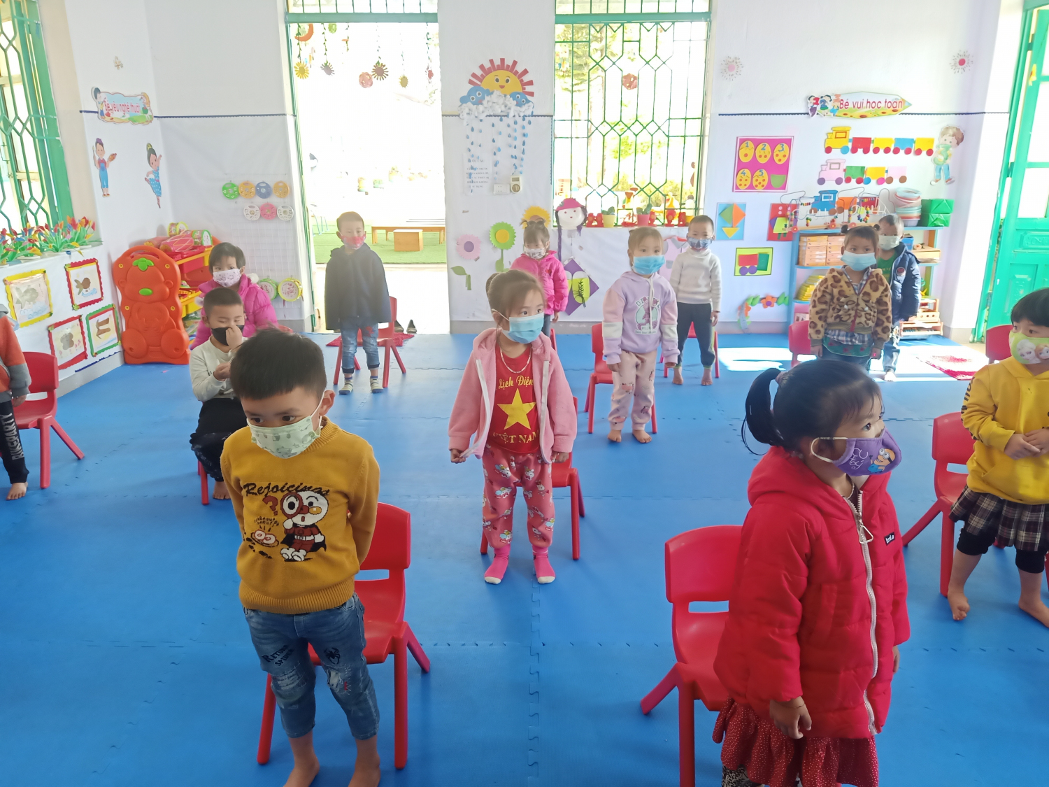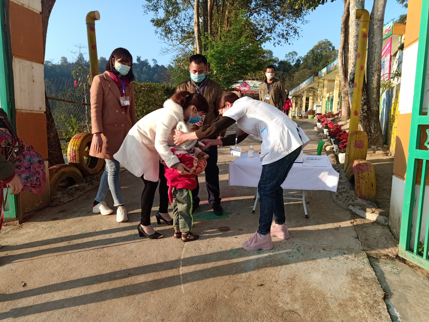 Ngay từ đầu giờ sáng,  Ban Giám hiệu cùng giáo viên nhà trường đã triển khai các phương án đo thân nhiệt và hướng dẫn vệ sinh tay cho các em, yêu cầu các bậc cha mẹ học sinh dừng tại cổng, không vào trong khuôn viên trường học.   Nhà trường cũng quán triệt cho cán bộ, giáo viên thường xuyên hướng dẫn học sinh cách rửa tay 6 bước, kiểm tra sức khỏe, lau nền nhà, tay nắm cửa, đồ chơi, dụng cụ học tập và các đồ vật trong phòng học, phòng chức năng bằng các chất tẩy rửa thông thường như xà phòng hoặc các dung dịch khử khuẩn khác.