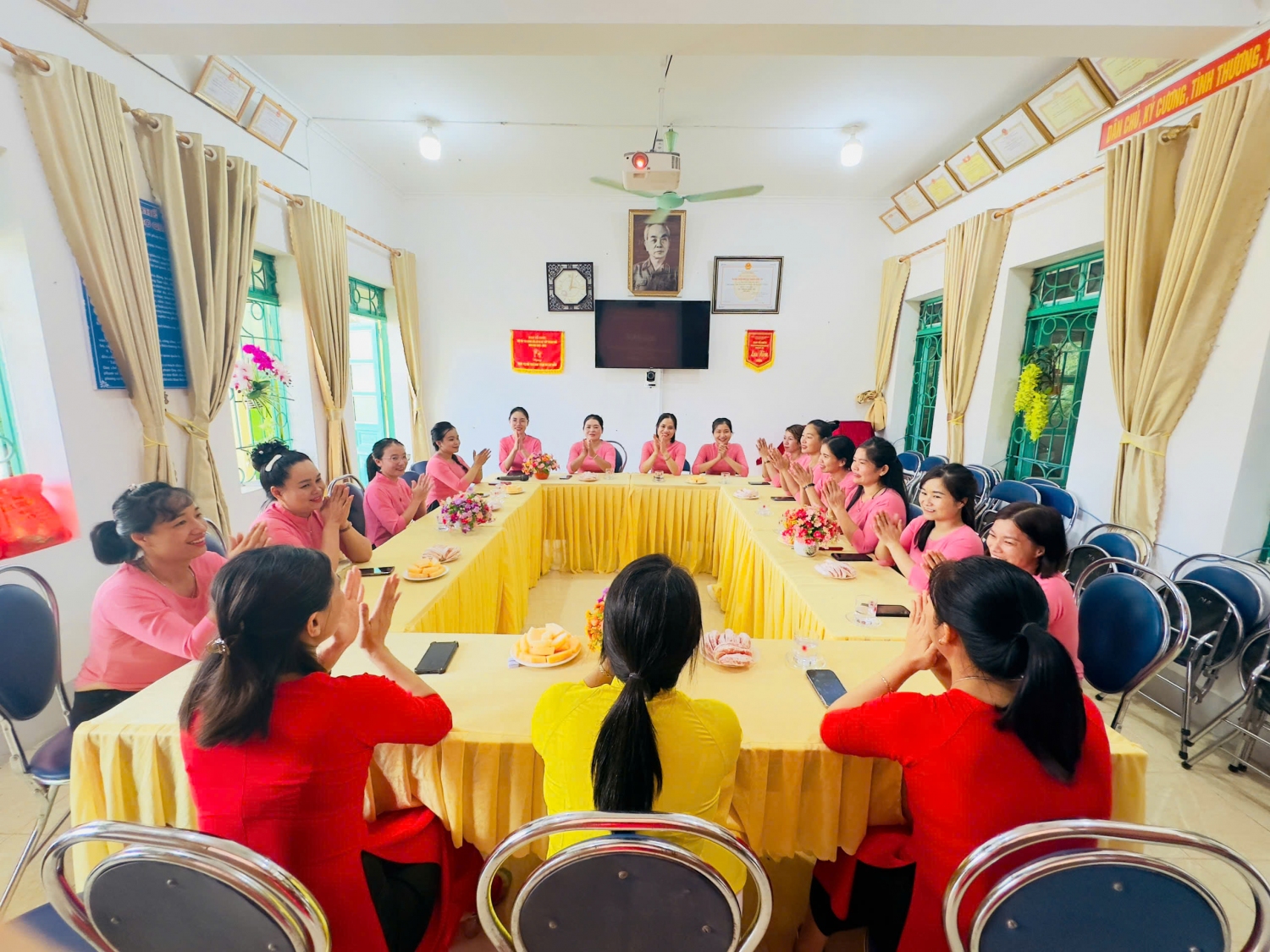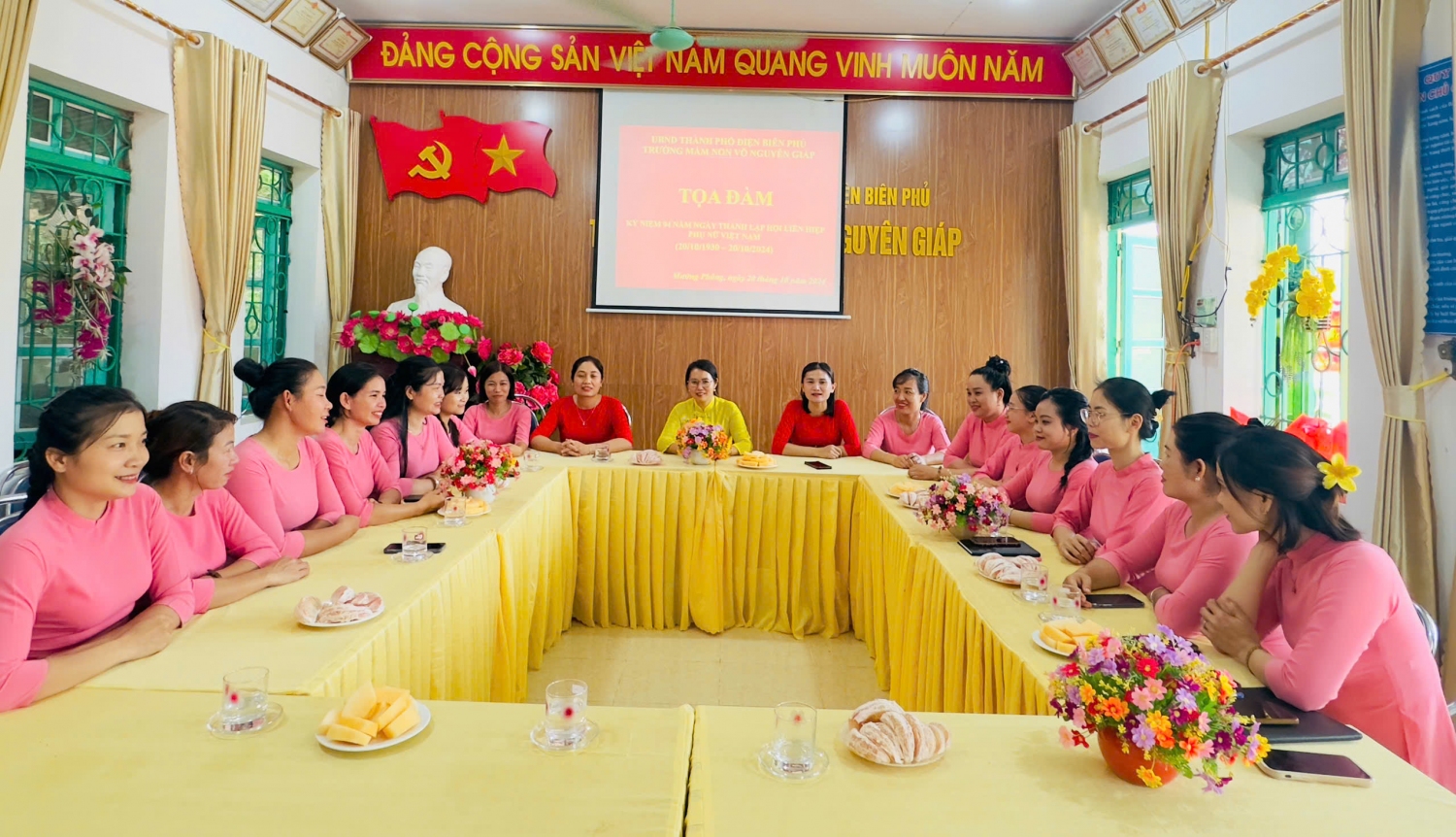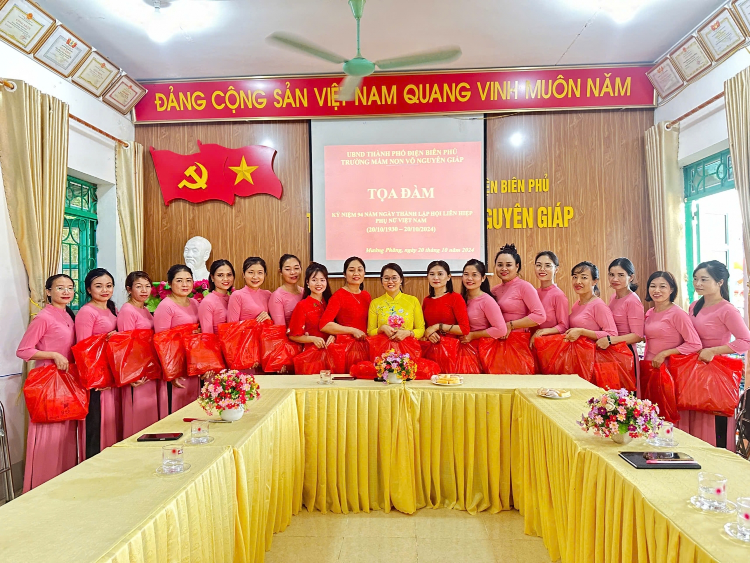 Ngày 18/10/2024 để tỏ bày tỏ tấm lòng biết ơn, sự kính trọng của mình đến một nửa của nhân loại, sự yêu thương vô hạn đối với các cô, các bà, các mẹ, các chị… cô và trò trường mầm non Võ Nguyên Giáp đã cùng nhau làm những tấm thiệp, những bức tranh, những bông hoa…để tặng người phụ nữ yêu thương nhân ngày 20/10. Cán bộ giáo viên , nhân viên trong trường đã cùng nhau tọa đàm về ngày 20/10.Tại buổi tọa đàm các đồng chí cán bộ, giáo viên, nhân viên  đã cùng nhau chia sẻ những kinh nghiệm, tâm tư và nguyện vọng, cùng nhìn lại chặng đường mà phụ nữ Việt Nam đã đi qua, từ đó định hướng và khuyến khích sự phát triển toàn diện hơn nữa của phụ nữ trong tương lai, vượt qua mọi khó khăn, thử thách, hoàn thành tốt mọi nhiệm vụ được giao.