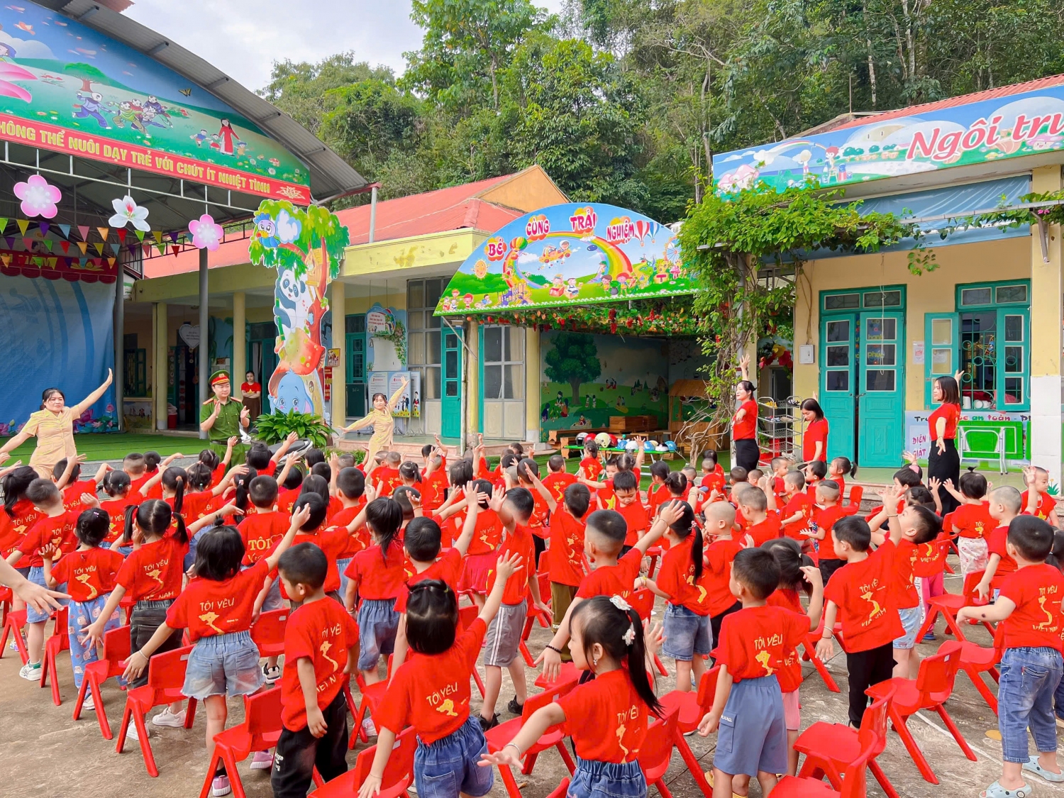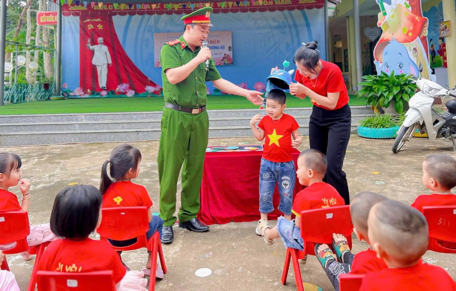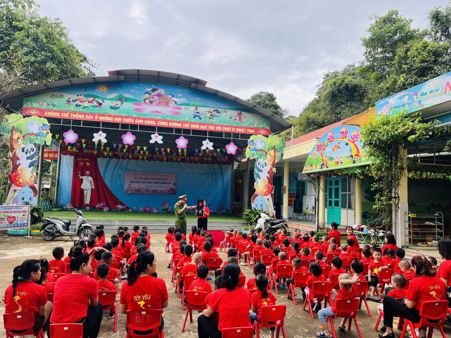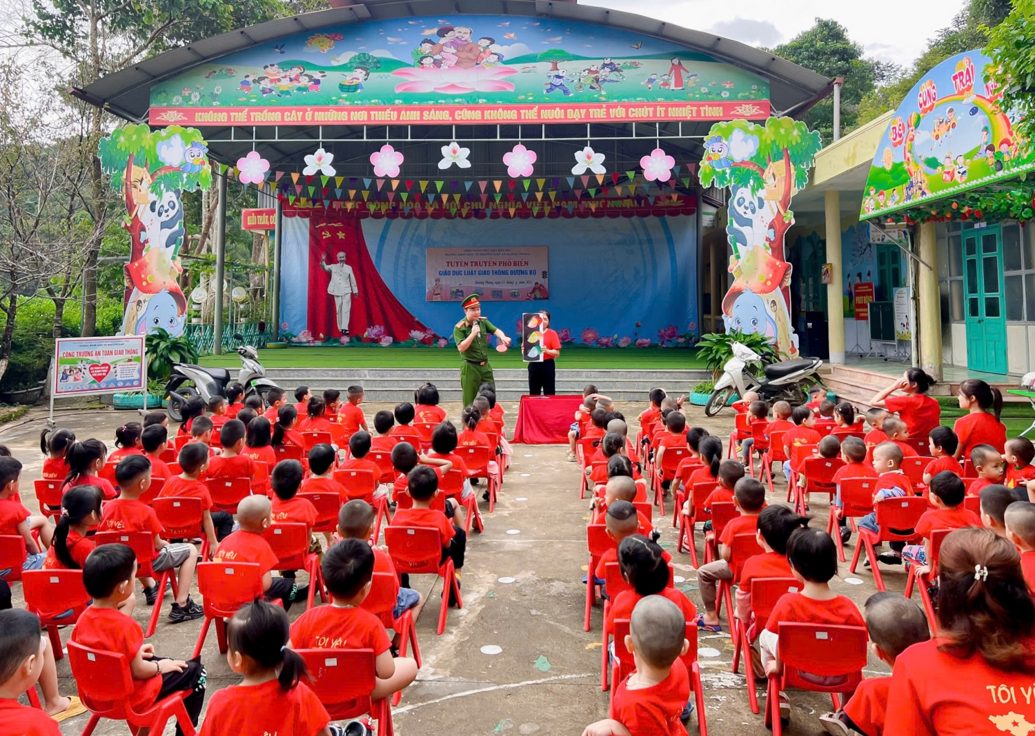 Thực hiện nhiệm vụ năm học 2024-2025 và tháng cao điểm an toàn giao thông với chủ đề “Tháng an toàn giao thông cho trẻ em đến trường”, ngày 23/9 trường Mầm non Võ Nguyên Giáp xã Mường Phăng kết hợp với công an xã Mường Phăng tổ chức Tuyên truyền Luật giao thông đường bộ cho gần 200 cán bộ, giáo viên, nhân viên và học sinh nhà trường.
