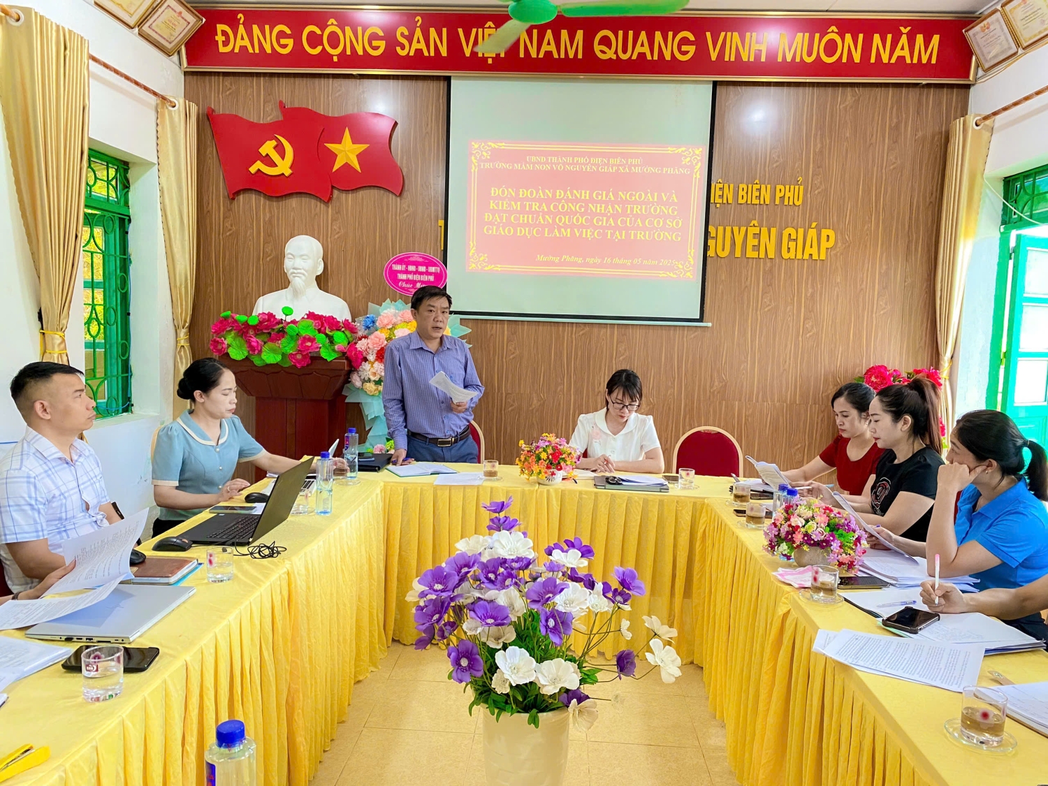 Sau thời gian nghiên cứu hồ sơ tự đánh giá, sáng ngày 16/5/2025 Trường Mầm non Võ Nguyên Giáp xã Mường Phăng vinh dự được đón tiếp đoàn đánh giá ngoài của Sở Giáo dục và Đào tạo về khảo sát chính thức tại trường. Đoàn gồm 7 thành viên, do đồng chí Lê Quang Vinh - Phó Giám đốc Sở Giáo dục và Đào tạo làm trưởng đoàn. Đồng chí Trần Thị Thúy – Phó Trưởng phòng Giáo dục Mầm non – Tiểu học làm thư ký. Về phía phòng GD&ĐT có các đồng chí: Đồng chí Bùi Thị Thu Hiền - Phó trưởng Phòng GD&ĐT thành phố Điện Biên Phủ, cùng các đồng chí chuyên viên cấp học Mầm non. Về phía chính quyền địa phương có đồng chí Hoàng Trung Thành - Phó chủ tịch UBND xã Mường Phăng. Tại buổi làm việc, đoàn đánh giá đã kiểm tra thực tế CSVC, trang thiết bị, các phòng chức năng, bếp ăn, tham quan các lớp và việc tổ chức các hoạt động chăm sóc nuôi dưỡng, giáo dục trẻ của nhà trường, nghiên cứu báo cáo, tài liệu do nhà trường cung cấp, kiểm tra các thông tin minh chứng của các tiêu chuẩn... Cũng tại buổi làm việc, đại diện đoàn đã gặp gỡ, trao đổi với các thành viên của Hội đồng tự đánh giá, phỏng vấn giáo viên, BGH nhà trường về hoạt động nuôi dưỡng, chăn sóc giáo dục trẻ. Kết thúc buổi làm việc, với tinh thần trách nhiệm cao, khách quan, dân chủ, đoàn đánh giá ngoài đã ghi nhận và đánh giá cao những điểm mạnh nổi bật của nhà trường, cụ thể: Nhà trường có cơ cấu bộ máy đảm bảo theo quy định, hồ sơ đầy đủ thông tin, sắp xếp khoa học, hợp lí; trang thiết bị dạy học, cơ sở vật chất đáp ứng điều kiện thực hiện CTGDMN. Môi trường xanh, sạch, đẹp, thân thiện... đáp ứng yêu cầu công tác chăm sóc nuôi dưỡng, giáo dục trẻ. Ban giám hiệu có sự chỉ đạo, định hướng đúng đắn trong việc xây dựng trường học hạnh phúc, thực sự lấy trẻ làm trung tâm... Đồng thời, đoàn đánh giá cũng đưa ra những tư vấn để nhà trường tiếp tục nâng cao chất lượng công tác chăm sóc nuôi dưỡng, giáo dục trẻ và phát triển hơn nữa.