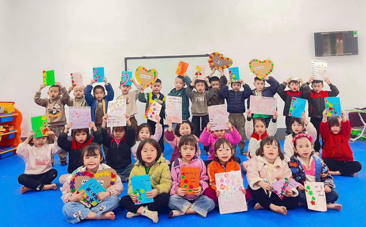 Để tỏ lòng biết ơn tới những người phụ nữ trong gia đình yêu thương. Các con đã tự tay trang trí những tấm thiệp đầy màu sắc, làm những bông hoa thật đẹp để gửi gắm tình yêu, lòng biết ơn và tình cảm dành tặng bà, tặng mẹ của mình nhận ngày Quốc tế Phụ nữ 8/3